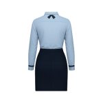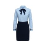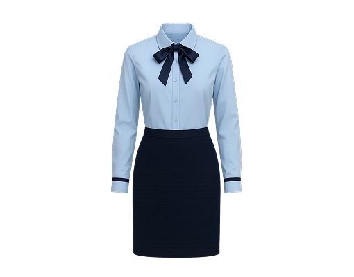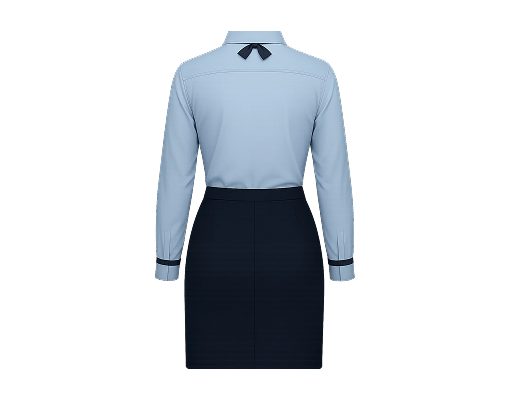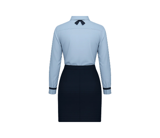 O conjunto é composto por uma camisa s ocial de manga longa e uma saia reta de cintura média, ambas desenvolvidas com atenção aos detalhes e com foco na usabilidade. A camisa possui um corte levemente ajustado, que valoriza a silhueta sem restringir os movimentos, além de contar com botões frontais discretos e um charmoso laço removível no colarinho — um detalhe que permite variar o visual de forma simples, mantendo sempre uma aparência elegante. A saia, por sua vez, oferece forro interno, zíper embutido e uma pequena fenda traseira, garantindo conforto, mobilidade e discrição ao longo da jornada de trabalho.